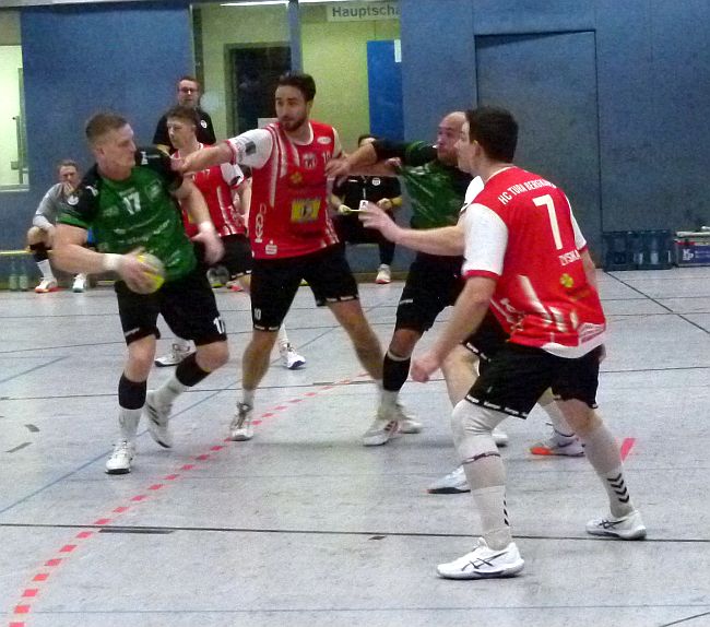 Zunächst gingen die Gäste aus Oberaden immer mit einem Tor in Führung, mussten aber im Gegenzug stets den Ausgleich hinnehmen. Nach 18 Spielminuten setzten sich dann aber die favorisierten Gastgeber mit 9:5 ab. Beide Mannschaften mussten in dieser frühen Phase des Spieles eine herben Verlust hinnehmen. Innerhalb von kurzer Zeit sahen auf Oberadener Seite Hendrik Schuchtmann und Pascal Terbeck auf TuRa-Seite die Rote Karte. Damit fehlten auf beiden Seiten fortan die Top-Torschützen. Schon in dieser frühen Anfangsphase wurde aber auch das TuRa-Manko in dieser Partie deutlich. Man ließ reihenweise beste Tormöglichkeiten ungenutzt, unter anderem vergab man fünf Siebenmeter oder scheiterte am überragenden Oberadener Torhüter Finn Bernemann. So kam Oberaden wieder in die Partie zurück. Bis zum Halbzeitpfiff der beiden sehr guten Schiedsrichter Feilbach und Reinstaedtler gingen die Gastgeber wieder mit 13:10 in Führung.