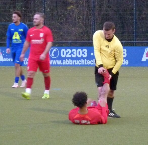 Bildzeile: Eine bemerkswerte Szene. Schiedsrichter Krishna Everding half dem Kamener Aydin Oruc bei einem Krampf.