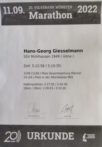 Seine Belohnung: Er hat durchgehalten und seine Laufzeit betrug 5.10.35 Stunden. Georg Gießelmann hatte seine Zeitvorgabe klar unterboten. In der Ergebnisliste gesamt war er auf Position 1.407 notiert. Das hieß bei den Männern Platz 1.108 und in seiner Altersklasse 65 Platz 24. Mehr als zufriedenstellend.