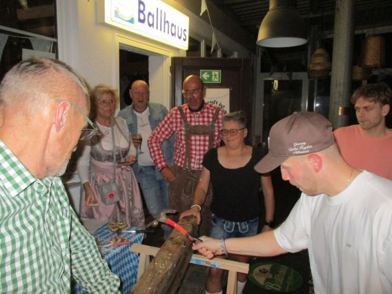 Bildzeile: Die Nagelprobe ist gelungen: Für ein Stündchen durften die Holzwickeder Kicker am Freitagabend nach dem Training das Oktoberfest des HSC besuchen. Den Hammer schwingt hier Maurice Majewski. Michael Vrljic (r.) beobachtet die Künste. In der Mitte „Spielleiter“ und HSC-Vize, Thomas Feldhaus.