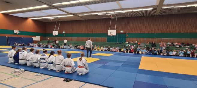 Judo: Am letzten Schultag veranstaltete der Judo Club Holzwickede gemeinsam mit der Aloysius Grundschule den Tag des Judo. Den Start machten die ersten und zweiten Klassen der Holzwickeder Grundschule mit einem gemeinsamen Aufwärmen nach der traditionellen Begrüßung.