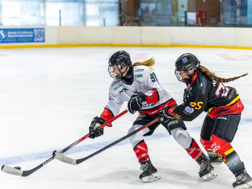 Bildzeile: Boglárka Koncz (HK Budapest) und Malin Winkel (EC Bergkamen) wetteifern in dieser Szene um den Puck / Fotocredit: Neckarlicht.