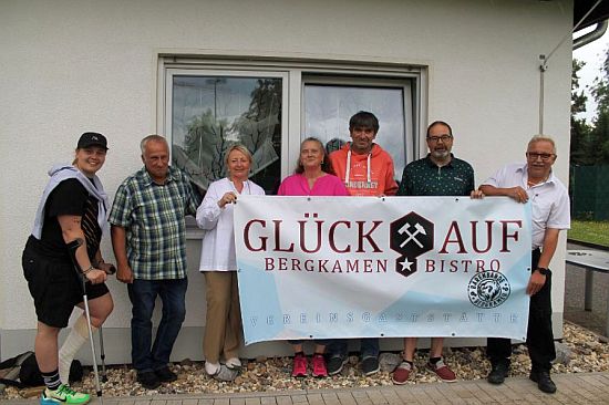 Bildzeile: Vereinsgaststätte „Glück Auf Bergkamen Bistro“ neuer Sponsor. (v.li.) Alena Hahn, Michael Körber, Ilona Pollmer, Shirley Schulz & Michael Tolksdorf (Inhaber Glück Auf Bergkamen Bistro), Dirk Clauberg, Andreas Hahn