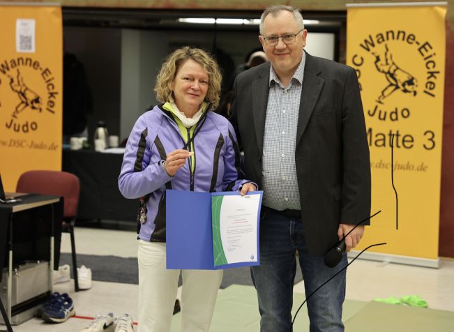 Bildzeile: Jörg Bräutigam, Präsident des Nordrhein-Westfälischen Judo-Verbandes, ehrte Dr. Bernadette Eller für ihr jahrzehntelanges Engagement als Mattenärztin mit der bronzenen Ehrennadel des Verbandes.