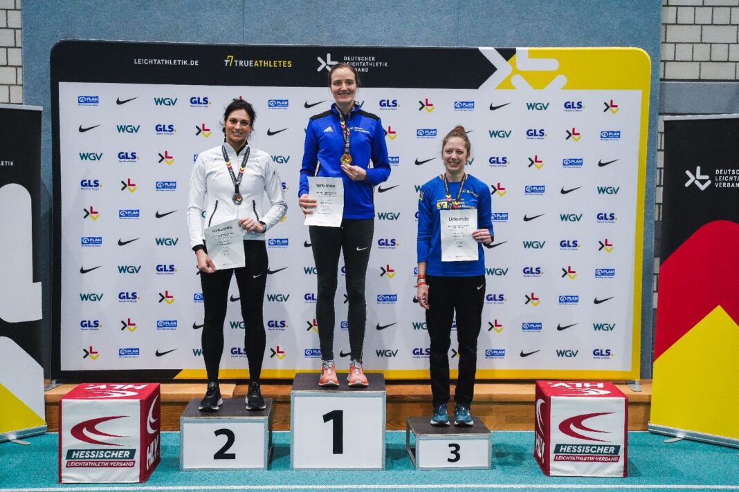 Bildzeile: Meike Holtkamp holte Gold im 60-m-Hürdenfinale bei den Deutschen Masters in Frankfurt und stand ganz auf dem Podest / Fotos VfL.