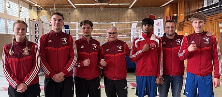 Bildzeile: Die Boxabteilung des PSV Unna mit (v.li.) Marie Kissing, Timon Lebrecht, Joel Kleiböhmer, Trainer Klaus Krajewski, Stefan Ayndic, Trainer Anatoli Heckmann und Alexej Kurz trat beim traditionsreichen New Years Cup in Hattingen an.