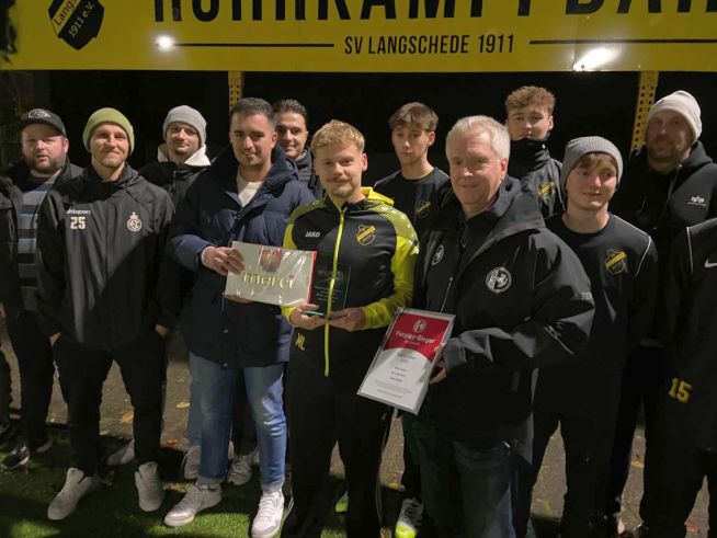 Bildzeile: Mick Lausch, Spieler des SV Langschede, wurde zum FLVW-Fairplay-Sieger des Monats September gewählt. Ulrich Rolfing (4.v.re.), Mitglied im Vorstand des Fußball-Kreises Unna-Hamm, überreichte im Auftrag des westfälischen Fußballverbandes Urkunde und Pokal an Mick Lausch.