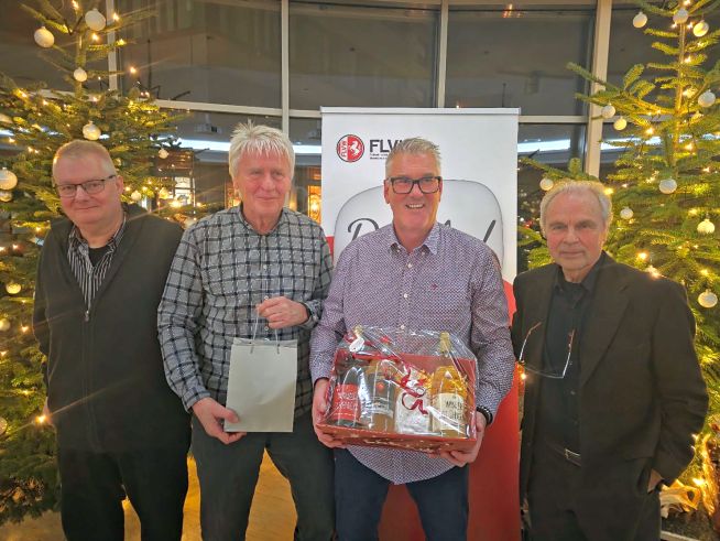 Bildzeile: Für ihre langjährige Vorstandsarbeit wurden Ulrich Eckei und Helge Kleinjohann von Michael Allery und Bernard Dietz ausgezeichnet mit dem Verbandsverdienstzeichen in Silber.