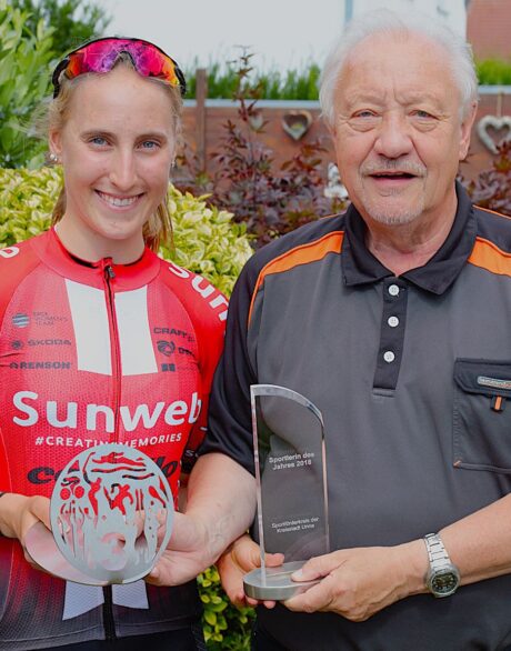 Bildzeile: Franzi Koch wurde 2018 zur Sportlerin des Jahres in Unna gewählt und erhielt den Ehrenpreis des KreisSportBund Unna. Rechts Hans Kuhn, der Vorsitzende des RSV Unna, gratuliert.