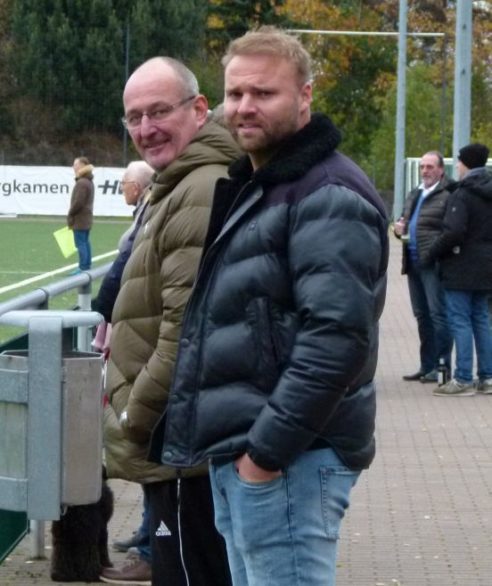 Bildzeile: Aufmerksamer Beobachter am Spielfeldrang in Kaiserau war Martin Schmelzer – hier zusammen mit dem 2. Vorsitzenden Alex Berger. Schmelzer übernimmt wie berichtet in der Winterpause das Traineramt beim SuS Kaiserau II.
