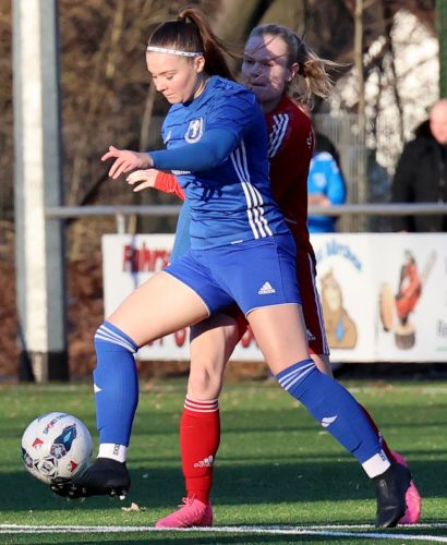 Bildzeile: Maja Gundelach vom BSV Heeren im Zweikampf mit einer Gegenspielerin von Sölderholz / Foto: Thorsten Niemann.