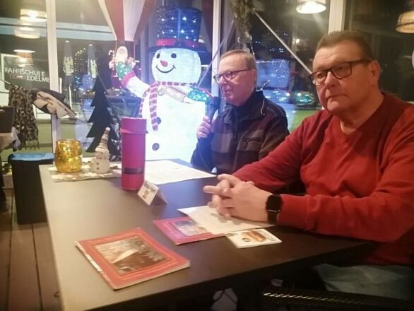 Bildzeile: Gerd Kolbe (links) trug beim HSC-Adventsfenster eine wahre Weihnachtsgeschichte vor, in deren Mittelpunkt der erste BVB-Nationalspieler, August Lenz, stand. HSC-Chef Karl-Friedrich Lösbrock freute sich über die große Resonanz auf die Veranstaltung.