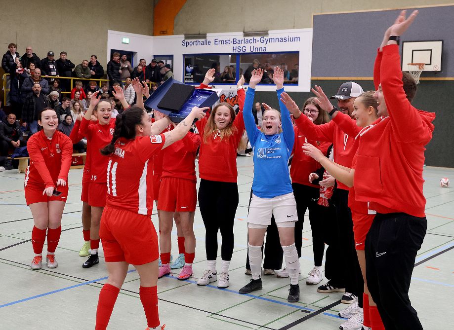 Fußball: Vor ausverkaufter Kulisse (600 Zuschauer) in der EBG-Sporthalle holten sich am Samstagabend die Damen von Rot-Weiß Unna wie im Vorjahr den Stadtmeistertitel von Unna. Sie blieben in den Doppel-Spielen gegen die Konkurrenz des Königsborner SV und BR Billmerich ungeschlagen. Bei den Herren war SSV Mühlhausen im Rennen um die Stadtkrone gegen RW Unna, Königsborner SV, FC Romania Unita und TuS Hemmerde siegreich.