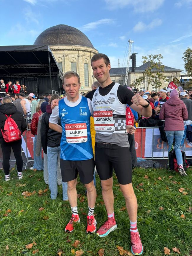 Bildzeile: Lukas Eckhoff (li.) und Jannick Niessner absolvierten den Köln Marathon wie geplant unter drei Stunden.