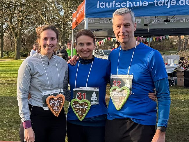 Bildzeile: Joana Flanse, Sabine und Thomas Pinger von den Lauffreunden Bönen gingen beim Drei-Stunden-Lauf des 4. Warendorfer Weihnachtslaufes an den Start.