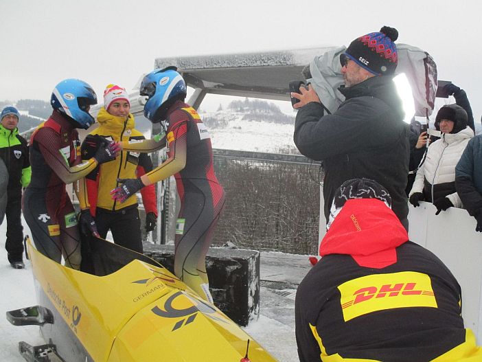 Wie bereits am vergangenen Sonntag in Winterberg im Gespräch mit sku angekündigt, gönnte Laura Nolte ihrer etatmäßigen Anschieberin Deborah Levi eine Pause. Levi feuerte zwar am Rand der Strecke Nolte lautstark an, sparte ihre Kräfte aber für die kommenden olympischen Aufgaben. Doch Leonie Kluwig (SC Potsdam) zeigte, dass sie bestens ins Nolte-Team passt und eine Top-Anschieberin ist. Im zweiten Durchgang verzeichneten Nolte/Kluwig sogar einen neuen Startrekord. In diesem zweiten Durchgang rasten Nolte/Kluwig von Platz sechs nach dem ersten Lauf mit einer Superleistung auf den Bronze-Platz. Auf die Zweiten, Melanie Hasler/Nadja Pasternack (Schweiz), fehlten gerade zwei hundertstel Sekunden. Auf die Siegerinnen, Kaillie Humphries/Jasmin Jones (USA), betrug der Rückstand minimale drei Hundertstel – eine wahre Zentimeterentscheidung.
