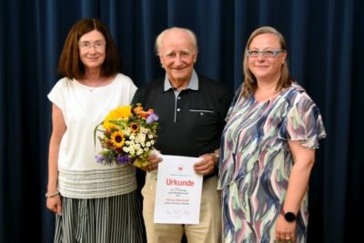 Bildzeile: (v.li.) Gaby Pitthoff Henkel (li.) und Tanja Lohn (re.) vom TVU-Vorstand ehrten Horst Altenhoff für 75 Jahre Vereinszugehörigkeit.