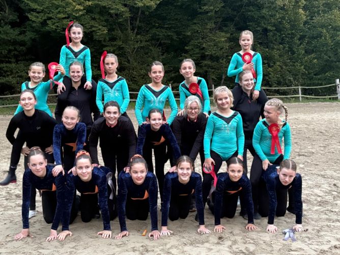 Die zweite Mannschaft ging in der Abteilung Galopp-Schritt-Schritt an den Start. Hier wird die Pflicht teils im Galopp, teils im Schritt gezeigt, ergänzt durch eine kreative Kür mit Einzel- undDoppelübungen im Schritt. Mit einer harmonischen Darbietung erreichte das Team den zweitenPlatz. Auf dem Pferd „Despi“ turnten Pia Mandischer, Xenia Godehard, Mia von Haza-Radlitz, EmmaSchulz, Clara Wirth, Louisa Heiduck, Miley Kohler und Diana Nagornych mit dem Trainerteam Nina Riedesel und Sabine Fritz.