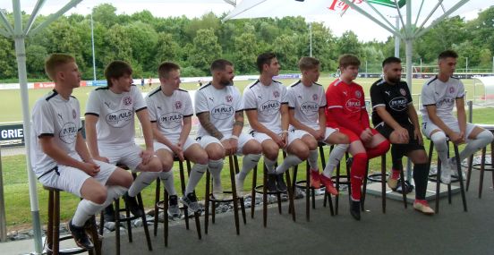 Bildzeile: Die Neuen der (zweiten) U23-Mannschaft: Julian Klotz, Rene Pascal Stiepermann, David Wilpert, Patrick Gambero, Lars Schmidt, Niklas Boyke, Lennis Ostermann, Idris Chamdin und Dominique Erwin.