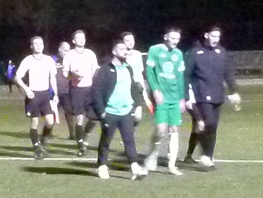 Bildzeile: In der Halbzeitpause drückt die Mimik der drei Massener – (v.li.) Hamza Berro, Nico Berghorst und Sascha Grasteit – noch keine Siegesgewissheit aus. Dahinter das Schirigespann mit Julian Siepmann (Mitte), der das Pokalspiel ausgezeichnet leitete.