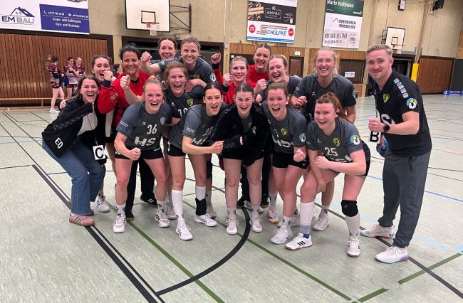 Bildzeile: Große Freude bei den SGH-Damen und Trainer Tim Severin (re.) über den 23:22-Heimsieg gegen TV Arnsberg / Foto SGH.