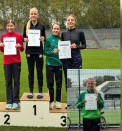 Im Anschluss gingen beide gemeinsam mit Mia Krappe und Annemieke Ewens über die 300-Meter-Strecke an den Start. Auch hier überzeugten alle vier Athletinnen mit neuen Saisonbestleistungen: Mia Krappe erreichte das Ziel in 48,68 Sekunden, Hannah Loges in 46,97 Sekunden, Charlotte Ewens verbesserte sich auf 46,52 Sekunden. Annemieke Ewens lief mit 42,70 Sekunden nicht nur die schnellste Zeit des Quartetts und des gesamten Wettkampfs, sondern stellte damit auch eine neue persönliche Bestleistung auf. Diese Zeit würde im kommenden Jahr für die Qualifikation für die Deutschen Meisterschaften reichen und ist gleichbedeutend mit Platz sieben der aktuellen deutschen Bestenliste ihrer Altersklasse.