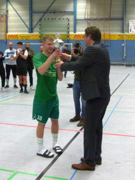 Bildzeile: Bergkamens stellvertretender Bürgermeiste Morten Puffke überrreicht den Stadtpokal an Oberadens Spielführer Joshua Kusch.