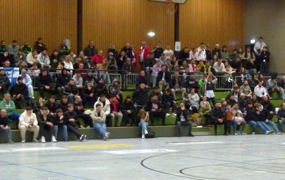 Bildzeile: Rund 500 Zuschauer verfolgten die Spiele bei der Stadtmeisterschaft. Besonders stimmungsvoll dabei der Angang des späteren Stadtmeisters TIU Rünthe