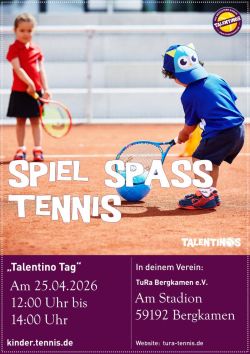 Tennis: Am 25. April 2026 findet der nächste TuRa Talentino Tag auf der Tennisanlage von TuRa Bergkamen statt. Wie in den letzten Jahren, sollen tennisinteressierten Kindern wieder die Möglichkeit gegeben werden, kostenfrei in den Tennissport reinzuschnuppern.