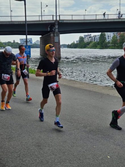 Für die Debütanten Eckhoff und Nowara begann der „längste Tag des Jahres“ beim Ironman Frankfurt im Langener Waldsee. Eckhoff schälte sich nach 1:10 Stunden aus dem Neoprenanzug, Nowara benötigte 1:26 Stunden. Bei windigen Bedingungen ging es für das TVG-Duo in zwei Runden durch das Frankfurter Umland. Eckhoff sauste mit 35 km/h im Schnitt über den Asphalt, nach 5:07 Stunden war die zweite Disziplin geschafft.