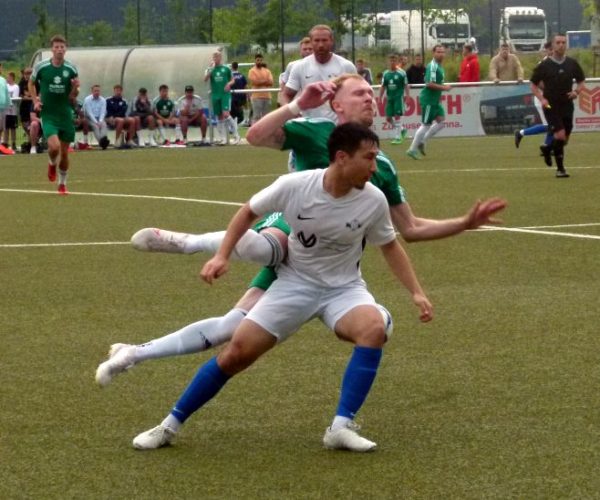 Bildzeile: Holzwickedes Philipp Gödde und Königsborns Christopher Simon wetteifern im Zweikampf um den Ball. Die Partie ging mit 2:1 für Westfalenligist Holzwickede aus.