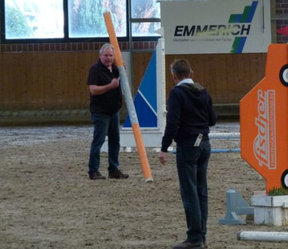 Bildzeile: Viel Arbeit hatten die Parcoursbauer in der Eventhalle. Nach jeder Prüfung musste der Parcours neu aufgebaut werden.