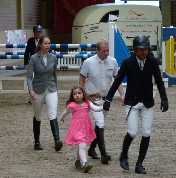Bildzeile: Vor jeder Prüfung nahmen die Reiter/innen den Parcours in Augenschein. Mit dabei hier auch eine Tochter eines Reiters.