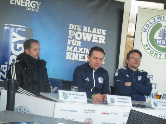 Bildzeile: Der neue HSC-Pressesprecher Daniel Dukic (Mitte) mit den beiden Trainern, Sascha Rammel li.) und Benjamin Hartlieb, bei der Pressekonferenz nach Spielschluss.
