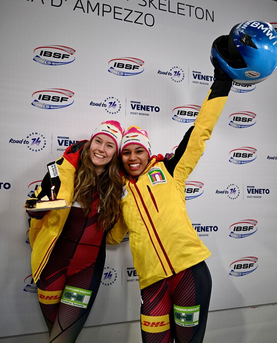 Bildzeile: Geburtstagskind Laura Nolte (links) freute sich mit Anschieberin Deborah Levi über ein Stückchen Torte und ein erfolgreiches Wochenende / Foto Viesturs Lacis/ IBSF.